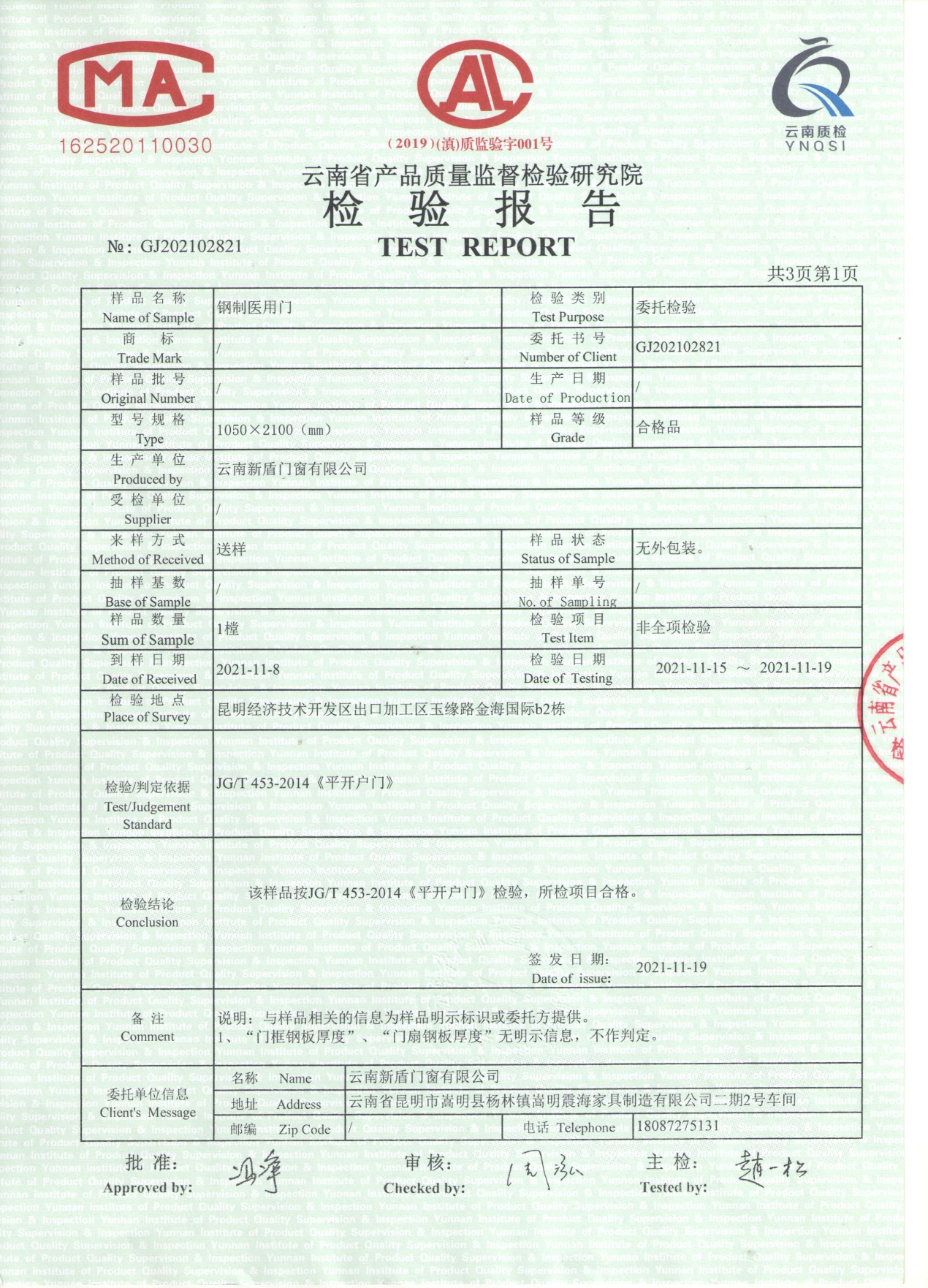 云南新盾鋼質(zhì)醫(yī)用門檢驗報告